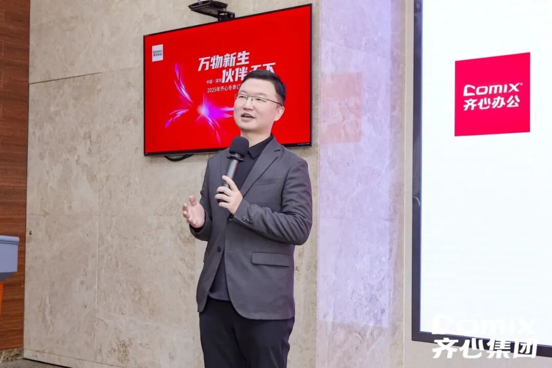 会议伊始,齐心集团品牌市场部总经理杨俊向现场经销商伙伴们致以热烈欢迎与衷心感谢。他提到,深耕行业30余年,齐心集团完成从传统文具制造商到中国B2B政企数字化集采服务商的跨越式转型,企业规模与品牌价值不断攀升。自有品牌作为核心业务之一,为企业长远发展筑牢根基。本次交流会聚焦齐心自有品牌2025冬季新品发布,以多元优质产品精准响应市场需求,携手合作伙伴构建深度共生的价值共同体,于行业变革浪潮中并肩前行。